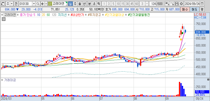 고려아연은 현재 MBK파트너스와 최 씨 일가 간의 치열한 경영권 다툼으로 인해 주가가 급등하고 있다. 공개매수 경쟁은 투자자들에게 큰 관심을 불러일으키고 있으며, 이는 한국 주식시장에서 주목해야 할 단기 트렌드로 자리 잡았다.