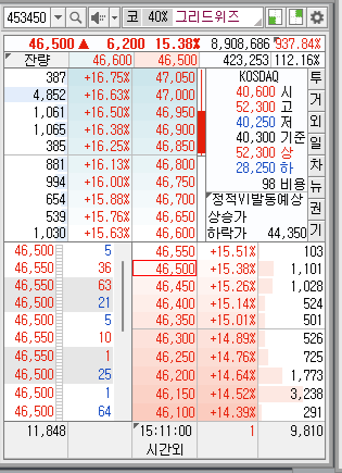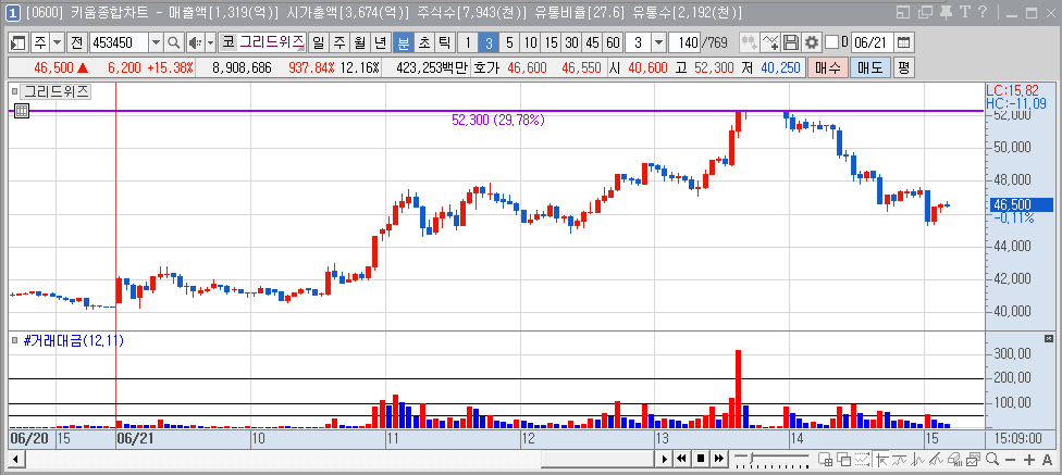 그리드위즈의 주가는 최근 몇 주간 상승세를 이어오고 있다. 이는 투자자들이 울산GPS 발전소의 상업가동 소식을 긍정적으로 받아들이고 있으며, 향후 기업 성장에 대한 기대감이 반영된 결과로 보인다. 금일 상한가 52300원에 도달 이후 상장일의 매도 물량을 감당하지 못하고 현재는 다시 하락 중에 있다. 다만 장중 상한가를 기록한 모습은 주식이 강한 매수세를 받고 있음을 나타낸다.