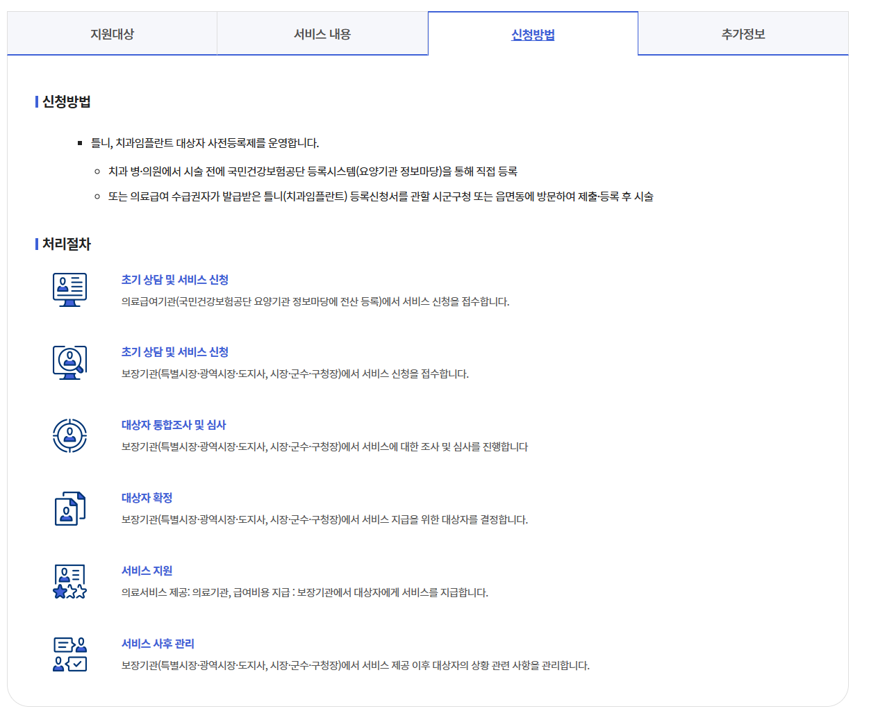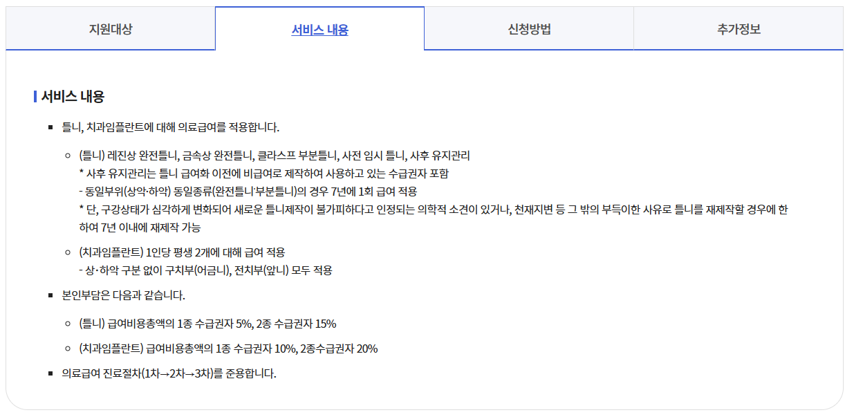 | 지원 신청 절차 | ① 치과에서 진료·판정 → ② 요양기관정보마당 등록(치과에서 대행) → ③ 국민건강보험공단 승인 → ④ 시술 시작 |