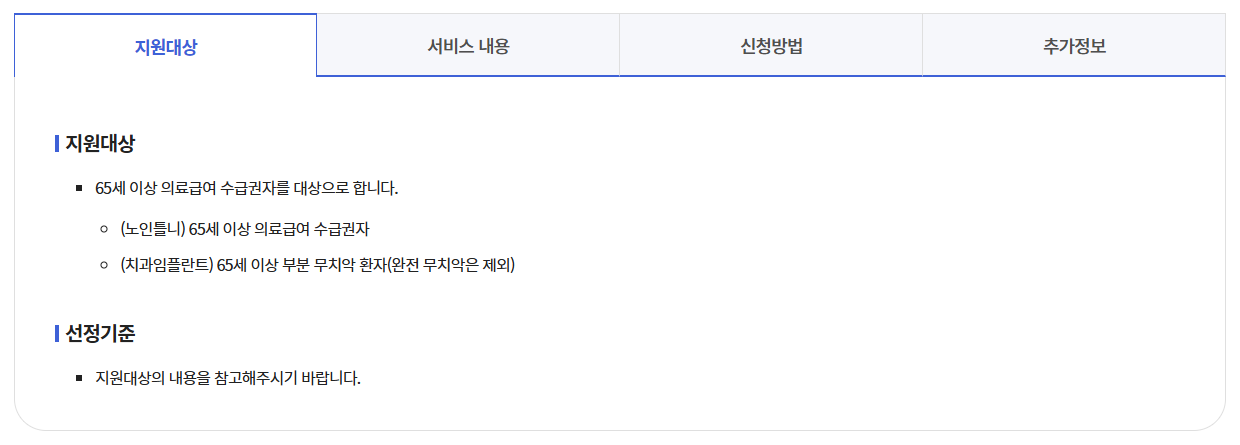 | 대상 | 만 65세 이상 건강보험 가입자(또는 피부양자) 중 부분 무치악 어르신 |