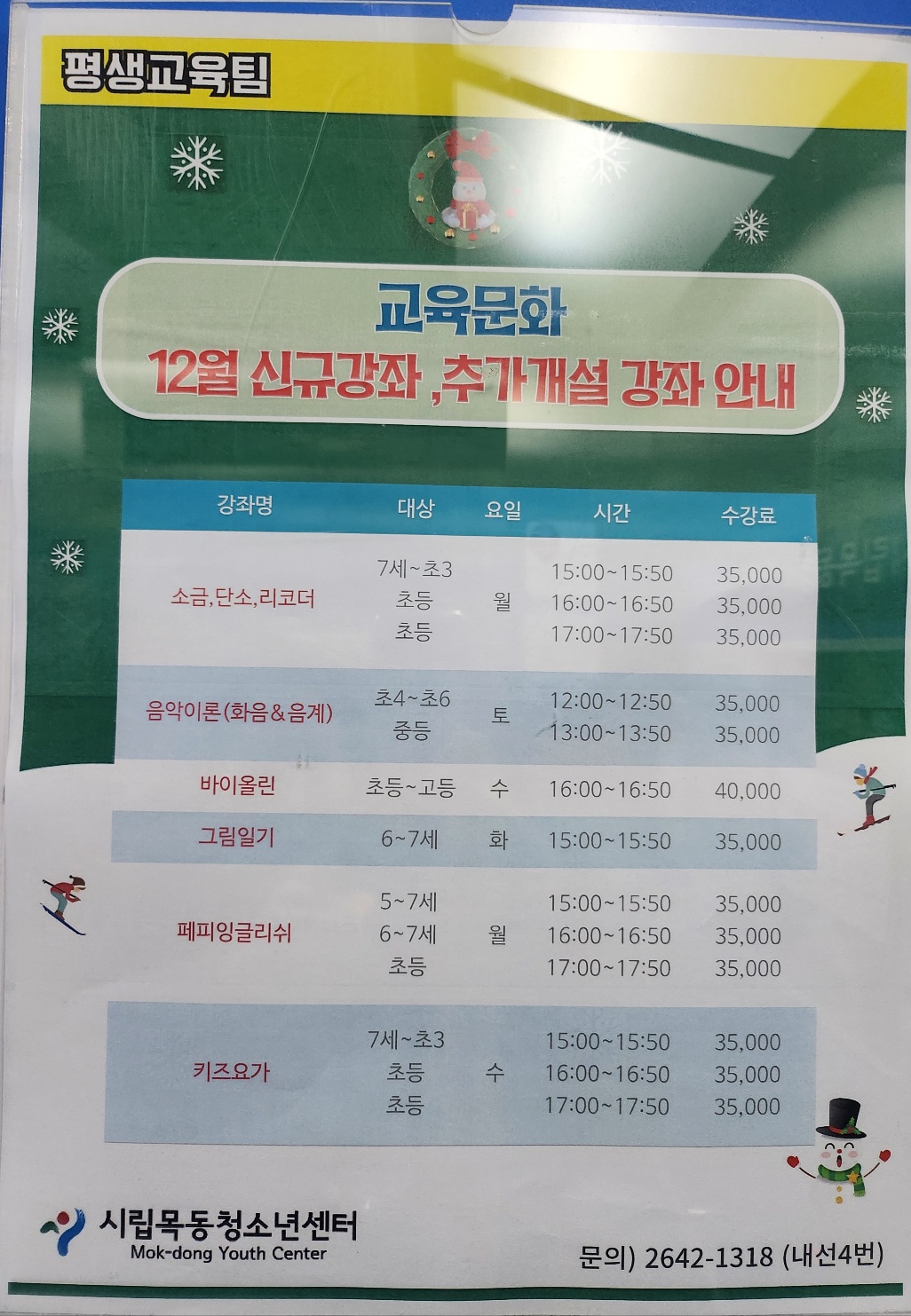 어린이수영, 청소년 농구교실, 어린이 인라인 스케이트 교실, 음악줄넘기교실 , 소수정예 튼튼 청소년 체육, 청소년 배드민턴교실, 체스, 보드게임, 미리 보는 3학년, 4학년, 5학년 과학교과서, 의사체험 교과 개념수학, 드론, 세계사, 보드게임 역사, 스피치, 한자, 단소, 소금 리코더, 디저트 만들기, 미술, 종이접기, 주산암산