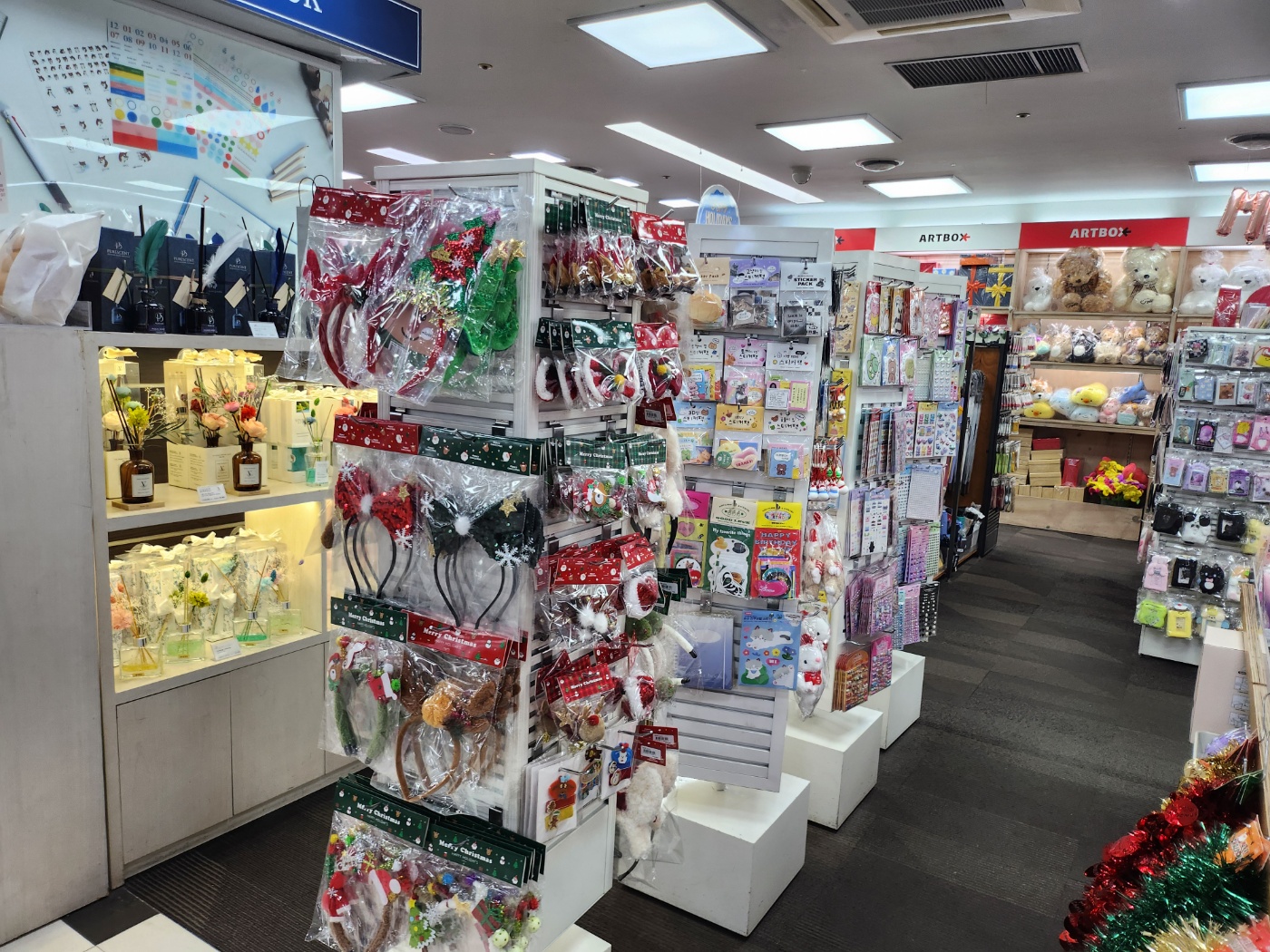 목동 교보문고 내 아트박스는 서점과 연결된 공간에 위치해 있어 책을 고른 후 바로 문구 소품을 구입할 수 있는 편리함을 제공합니다. 아트박스 매장은 깔끔하고 아늑한 분위기 속에서 쇼핑을 즐길 수 있도록 디자인되어 있어, 차분한 분위기에서 다양한 소품을 천천히 구경하며 쇼핑할 수 있습니다.