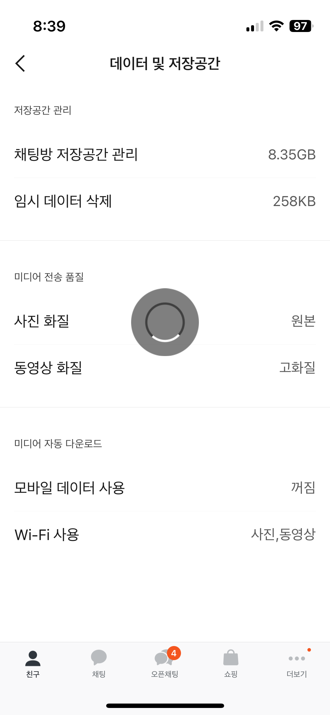 설정에서 iphone 저장 공간이 부족한걸 알았다면 카카오톡 톱니바퀴 누르고 전체설정으로 들어갑니다. 이후 데이터 및 저장공간 터치. 채팅방 저장공간 관리 누르고 미디어 데이터 모두 삭제를 누르면 모든 채팅방에 사진 및 동영상 다 지워지면서 여유공간이 충분히 생겨납니다. 다만 중요한 파일이나 사진, 동영상은 꼭 다운로드 받아서 컴퓨터에 저장한 후에 삭제하세요.