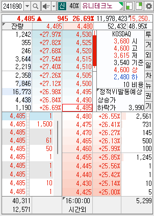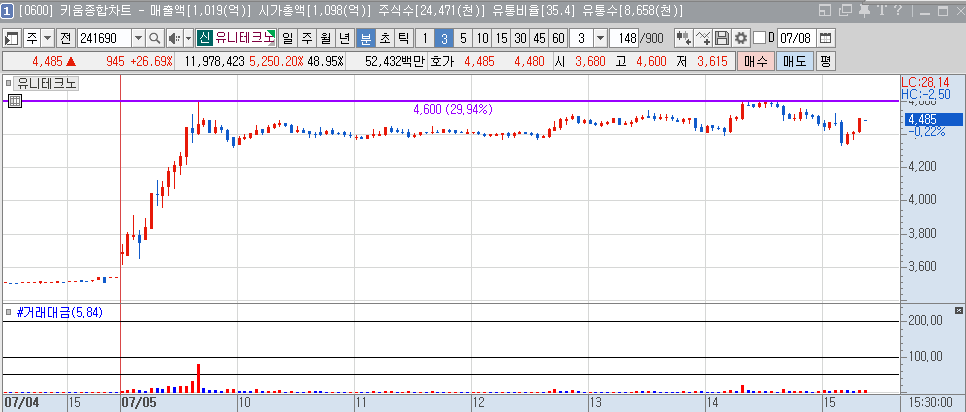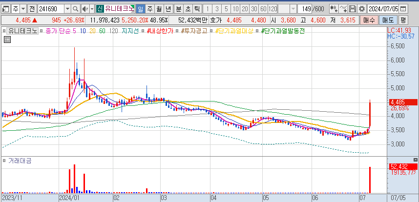 최근 유니테크노 주가는 상승세를 이어가고 있습니다. 7월 5일 오전 9시 35분 기준, 유니테크노 주가는 전일 대비 520원(20.34%) 오른 4260원에 거래되고 있습니다. 이는 삼성SDI와의 협력 소식이 반영된 결과로, 향후 추가적인 상승 여력이 있음을 시사합니다. 차트 상으로도 50일 이동평균선을 상회하며 강력한 지지선을 형성하고 있어, 추가 상승에 대한 기대가 큽니다.