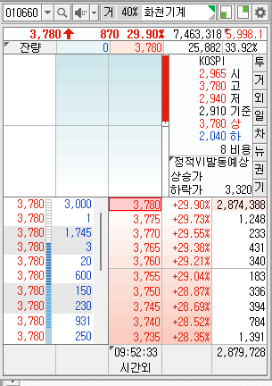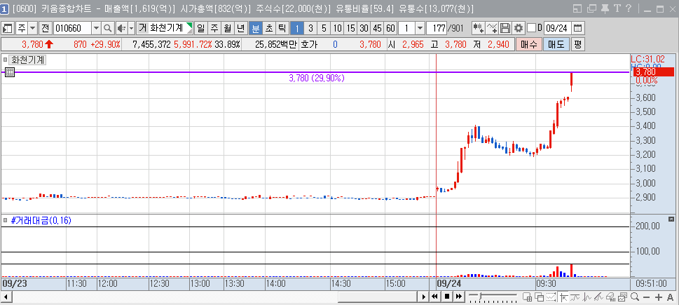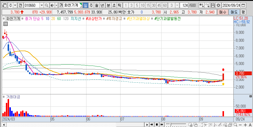 화천기계는 최근 에프앤가이드와의 경영권 분쟁 및 사업 다각화를 위한 투자 결정으로 주가 상승을 기록하고 있다. 2024년 9월 24일 장 초반 기준으로 화천기계의 주가는 전날 대비 11.00% 상승했으며 현재 상한가 기록 중이다. 이는 경영권 분쟁 및 투자 관련 이슈로 인한 시장의 반응으로 분석된다.