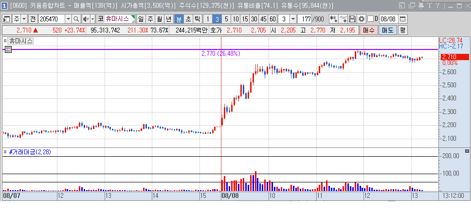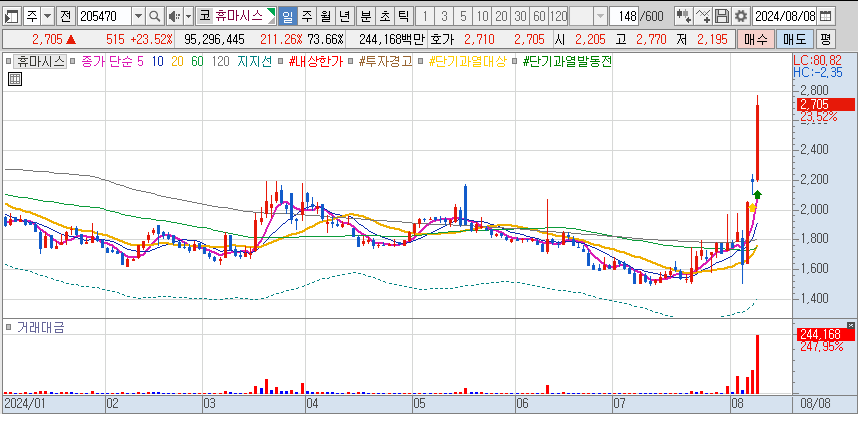 2024년 8월 8일 오전 기준으로 휴마시스 주가는 전일 대비 19.18% 상승한 2610원에 거래되고 있습니다. 이 같은 급등세는 코로나19 진단키트의 수요 증가로 인한 실적 개선 기대감 때문입니다.