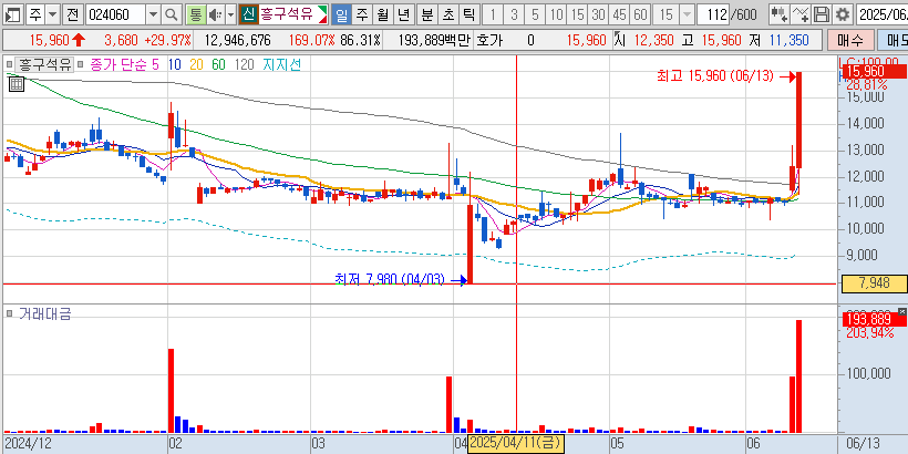 현재 흥구석유의 주가는 전날 대비 29.97% 상승한 15,960원으로 상한가를 기록 중입니다. 이 종목은 단기 이벤트성 테마주처럼 보일 수 있으나, 원유 가격이 일정 수준 이상으로 유지된다면 실적에 직접적인 긍정 영향이 예상됩니다.
